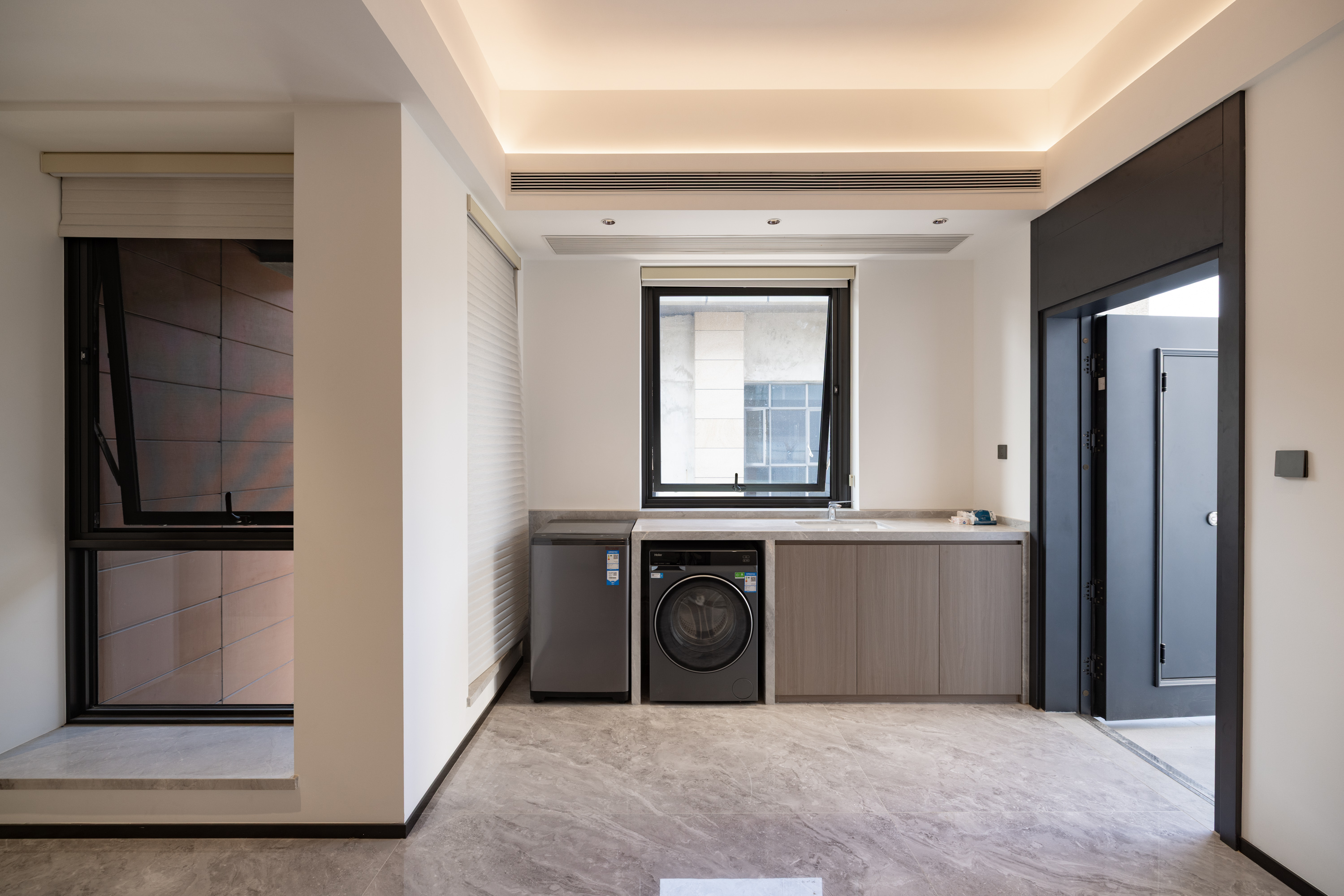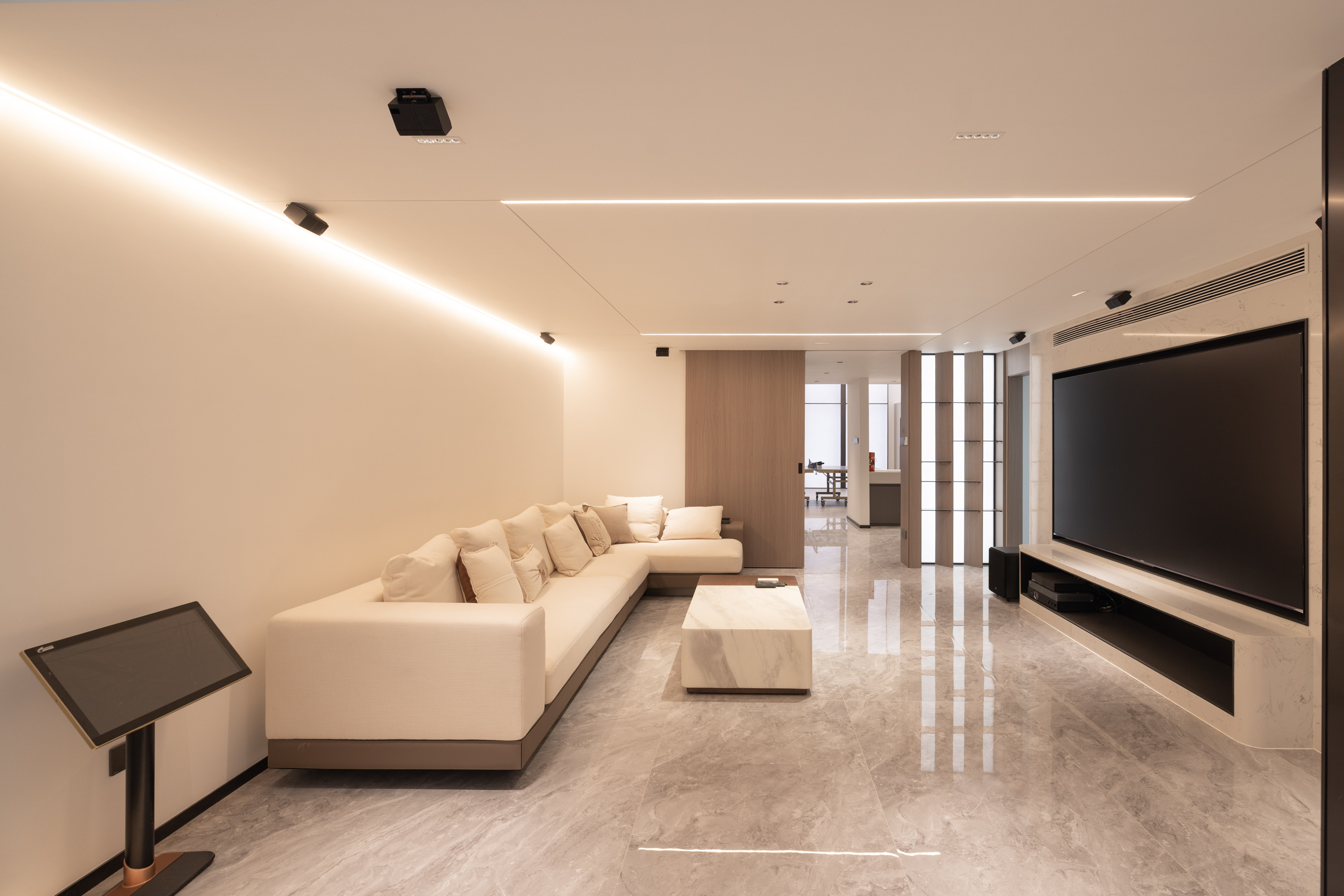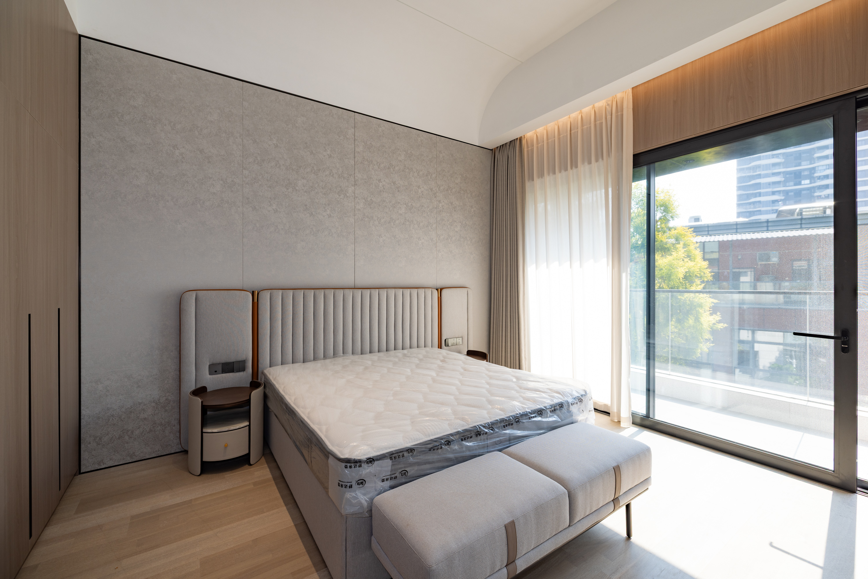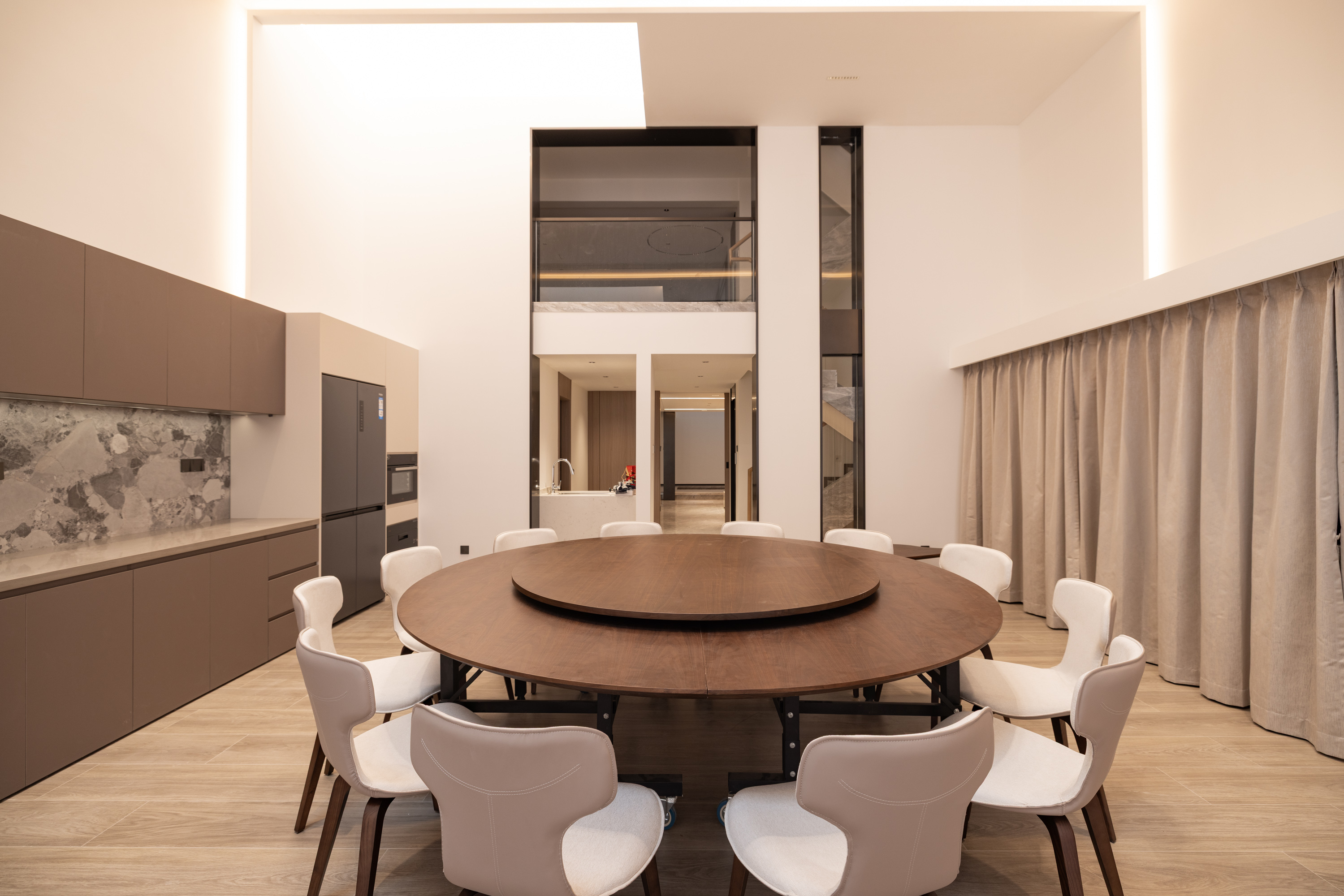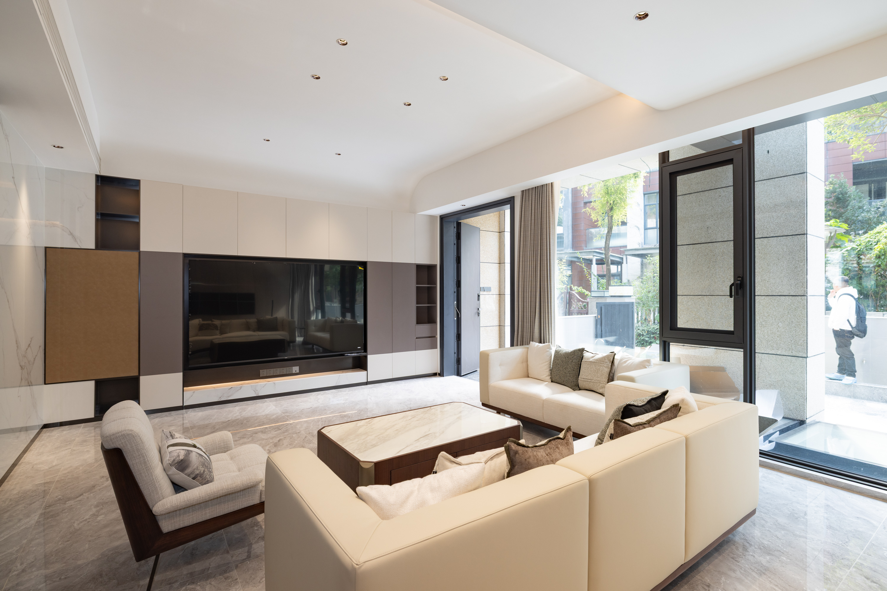 该项目设计注重空间与自然的融合,通过大面积景观窗、开放式布局引光纳景,让阳光与绿意成为日常生活的背景。选材与工艺强调高品质与环保性,木饰面与岩板的结合颇具沉稳感,简约干净更显高级,营造出兼具艺术格调与舒适度的居住体验,充分契合洋房与别墅等不同产品的空间特性,打造独一无二的雅居艺境。